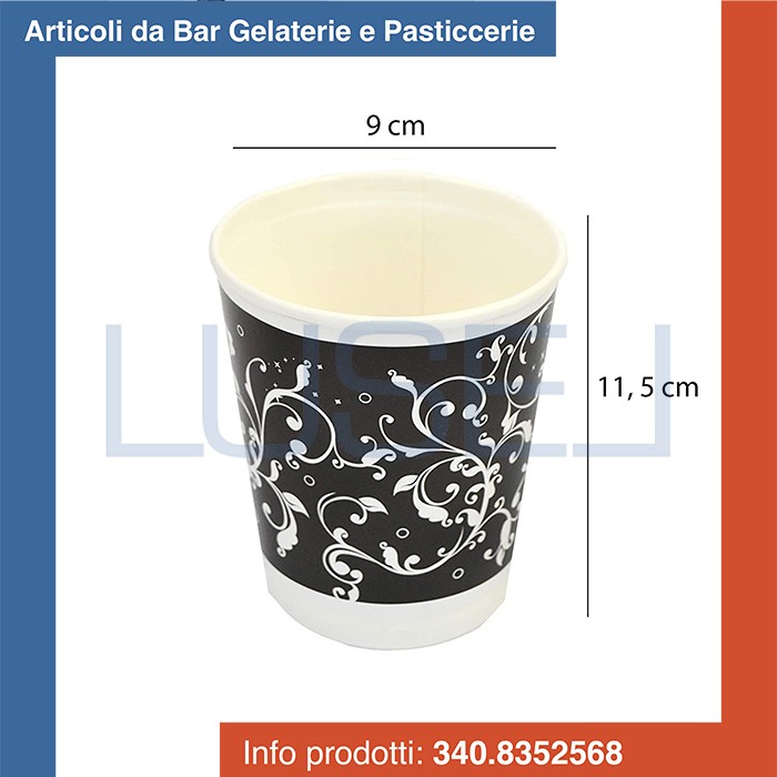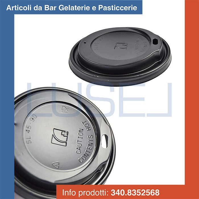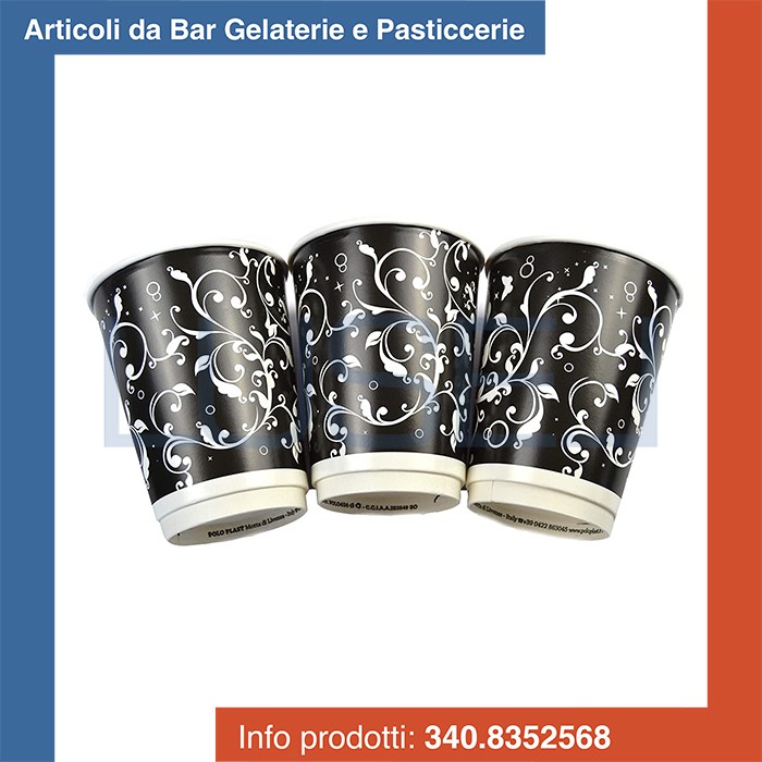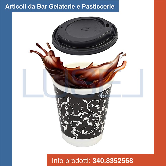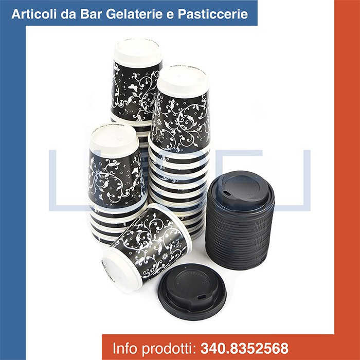Bicchieri 450 ml in carta decorato abbinato coperchio nero con beccuccio, accontenta i consumatori più esigenti