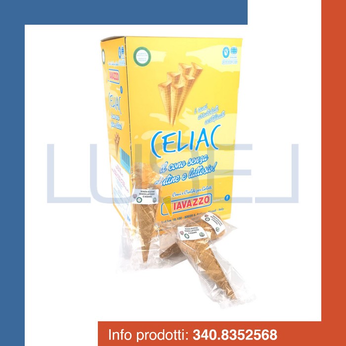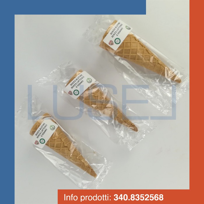 Cono per gelato senza glutine, coni per gelaterie farina di riso imbustato singolarmente ideale per i celiaci ed i vegani. Si caratterizza per il suo gusto delicato e per la sua estrema croccantezza.